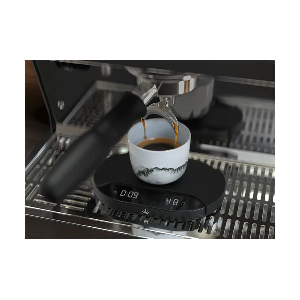 To set your scale, first manually dial in a shot using the scale. Once dialled in, set your recipe weight, burr distance and brew time on compatible GbS grinders (ignoring pre-infusion time). Then, enable Grind-by-Sync on your grinder’s recipe menu. Extract another espresso to the desired ratio using the grinder’s auto Grind-by-Sync and the Sync Scale. If the shot timing is longer or shorter than your original programming, the scale communicates with the grinder to automatically fine-tune the burr distance and maintain your recipe pre-set.